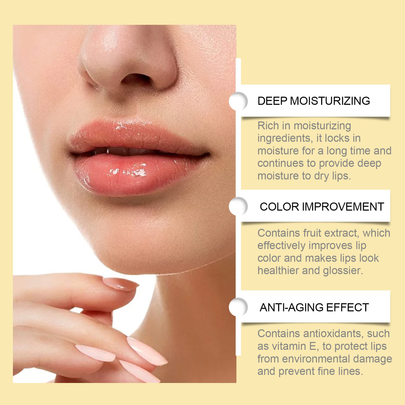 Our propolis lip mask contains propolis extract and vitamin E. It locks in moisture for a long time and continues to provide deep moisturizing for dry lips. Its use method is very simple: thoroughly clean the lip skin, dry it first, take an appropriate amount of lip mask, and evenly apply it to the lip skin. It can gently remove dead skin cells and restore the smooth texture of lips.
